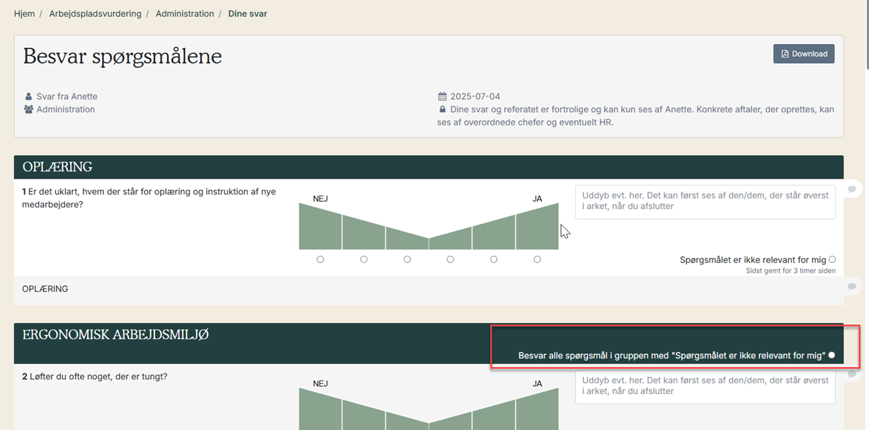 I en spørgeramme med flere spørgsmål, der kan besvares med “Ikke relevant”, kan der i gruppeoverskriften tilføjes en mulighed for at besvare alle spørgsmålene med “Spørgsmålet er ikke relevant for mig”.