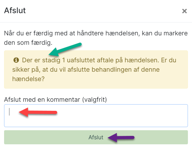 Er der uafsluttede aftaler på hændelsen, vil der komme en besked om det (grøn pil). Hændelsen kan afsluttes selvom, at der er uafsluttede aftaler. Det er den ansvarliges ansvar at få afsluttet aftalerne.