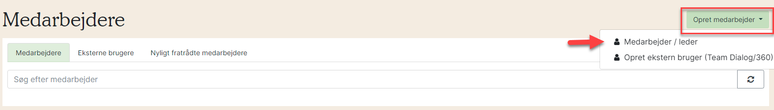2. Tryk "Opret ny medarbejder" og vælg, om det skal være ny medarbejder/leder eller ekstern bruger.