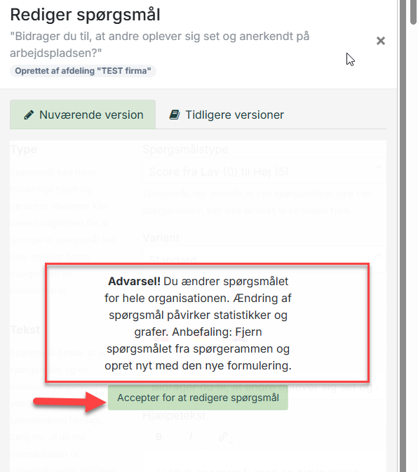 - Vil du alligevel ændre spørgsmålet, så klik på "Accepter for at redigere spørgsmål" (rød pil) for at komme videre.