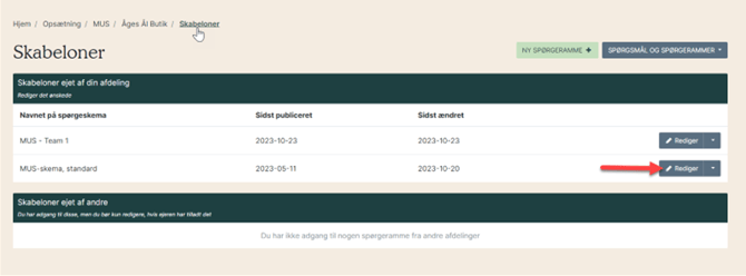 Vælg den spørgerammen der skal redigeres ved at klikke på "Rediger" (rød pil).