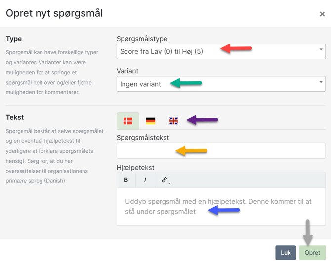 - Blå pil: Skriv eventuelt en hjælpetekst til spørgsmålet.