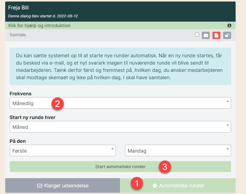 I ’Løbende 1:1’ er det muligt at opsætte automatiske runder, så skemaet automatisk sendes ud til medarbejderen på bestemte tidspunkter.