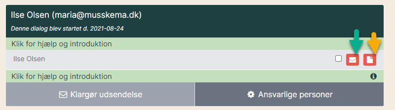 4. Når skemaet er sendt til medarbejderen, ændrer kuvertfarven sig fra grå til rød (grøn pil). Hvis medarbejderen er i gang med at udfylde skemaet, bliver kuverten gul, og når det er afsluttet, bliver den grøn. Det samme gælder for referatarket (gul pil). Når det er rødt, har det endnu ikke været åbnet. Er det gult, har det været åbnet, og når det er grønt, er det afsluttet. Når referatet er afsluttet, flyttes dialogen til arkivet.