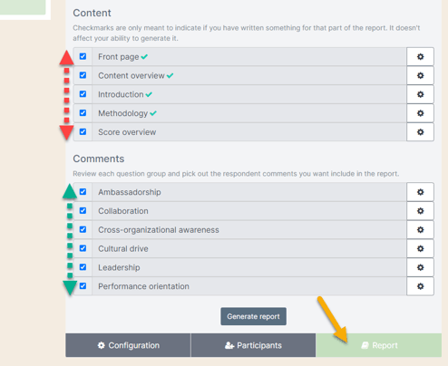 When everybody has answered – or enough respondents have answered (minimum 4 employees, 2 from other groups and from central person, see below)– you, as report responsible, can create a report. Click “Report” (red arrow).