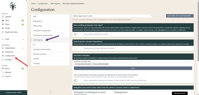 Go to 'Configuration' (red arrow) on the left sidebar and click on '360 degree' (purple arrow).