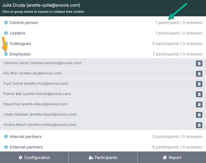 - Yellow arrow: Click on the group name to view the respondents in that group.