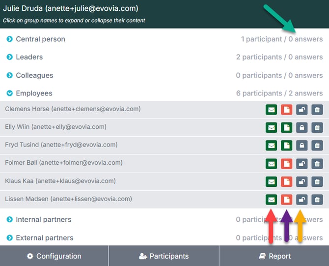 Purple arrow: When an employee has completed their questionnaire, the paper icon turns green.